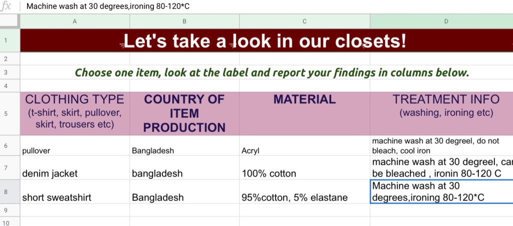 - Task 2: When you usually say how ‘green’ you are, what you wear is probably not on your checklist. Perhaps it should be… Look into your wardrobe, choose and item, look at the label and fill in the information